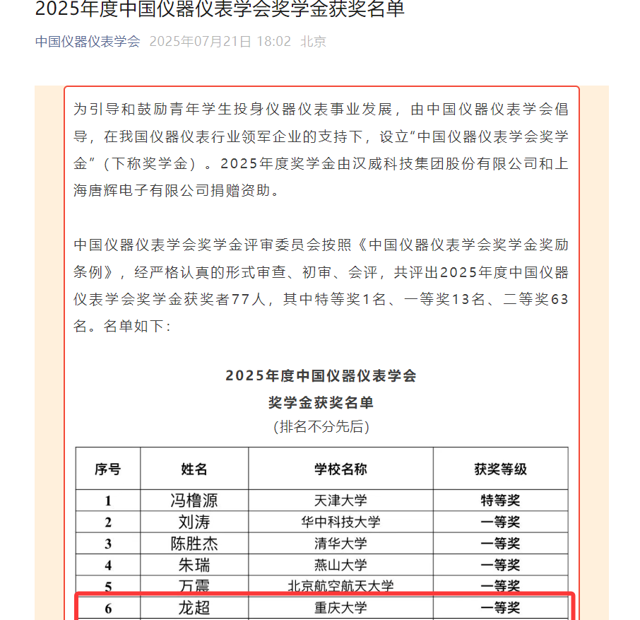 近日,中国仪器仪表学会公布了2025年度中国仪器仪表学会奖学金评选结果,经严格认真的形式审查、初审、会评,共评出获奖者77...[详细]