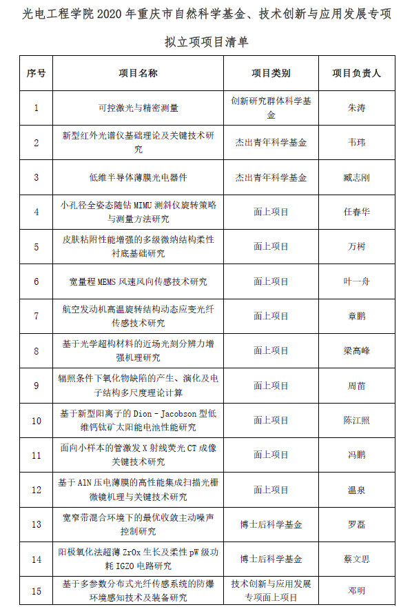 2020年重庆市自然科学基金、技术创新与应用发展专项评审结果日前公示,今年公司共有15项基金获得资助(见附表),其中重庆市自然科学基金创新研究群体科学基金1项、杰出青年科学基金2项、面上项目9项、博士后科学基金2项,重庆市技术创新与应用发展专项面上项目1项。 今年在疫情期间,公司高度重视基金申报工作,坚持“停课不停研”,科学谋...[查看详情]