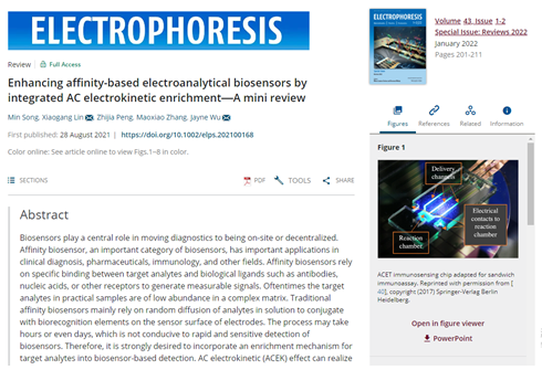 1月2日,国际权威期刊《ELECTROPHORESIS》2022年第1-2期的封面论文发表了林晓钢教授团队题为“Enhancing affinity-based electroanalytical biosensors by integrated AC electrokinetic enrichment—A mini review”的综述论文(https://analyticalsciencejournals.onlinelibrary.wiley.com/toc/15222683/2022/43/1-2)。公司仪器仪表工...[查看详情]