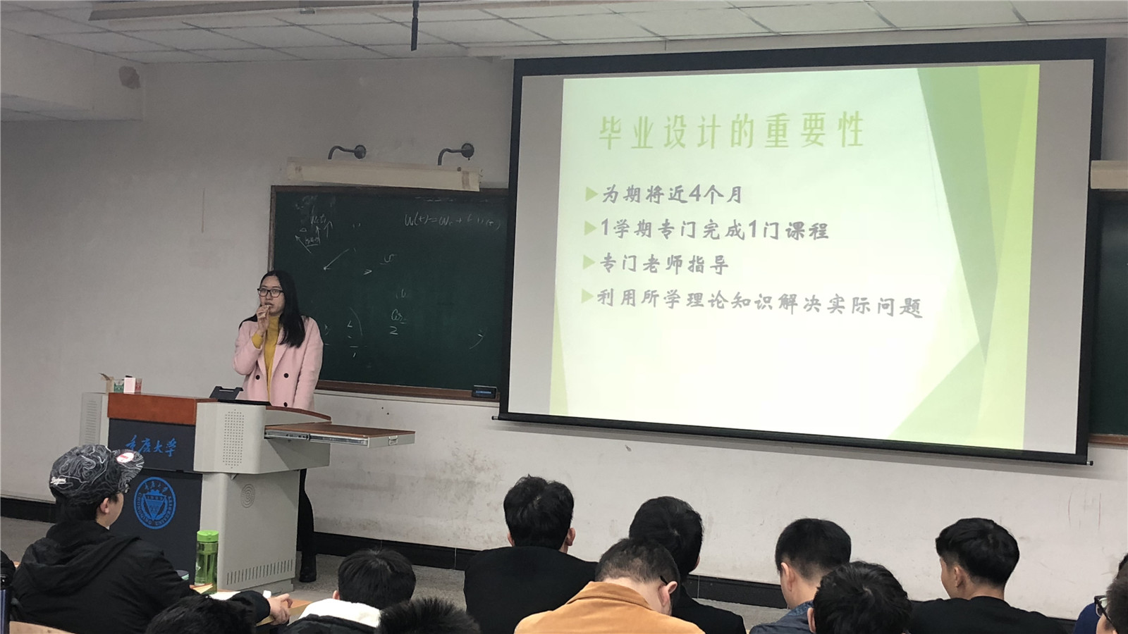 随后,公司教务秘书邓燕为大家介绍了毕业设计相关事宜。邓老师强调了毕业设计对大家的重要性,毕业设计是大家毕业前的最后考核,这和同学们的顺利毕业或着推免都息息相关,希望大家能够重视。邓老师给同学们详细介绍了毕业设计的主要流程,以及毕业设计中应该注意的问题。希望大家能够按要求做好毕业设计,顺利毕业。