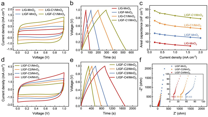 近日,威廉体育williamhill陈显平教授团队在Carbon(TOP期刊)上发表了题为《SWCNT-bridged laser-induced graphene fibers decorated with MnO2 nanoparticles for high-performance flexible micro-supercapacitors》的研究论文。本文首先通过调控激光参数成功制备了簇状的石墨烯纤维(LIGF),然后滴加单壁碳纳米管溶液(SWCNT),其分散在LIGF之间和表面。起到桥接LIGF的作用,从而形成具有粗糙表面以及高导电的LIGF/SWCNT网络。最后,在此网络上通过常温化学沉积法生长了大量的二氧化锰纳米粒子(MnO2),合成了LIGF-SWCNT/MnO2复合电极。在LIGF/SWCNT高导电网络和高赝电容MnO2纳米粒子的协同作用下,基于LIGF-SWCNT/MnO2复合电极的柔性微型超级电容器(MSC)具有优异的电化学性能,例如极高的面积比电容(156.94 mF cm-2),大的面积能量密度(21.8μWh cm-2)以及出色的循环稳定性。因此,这项工作中提出的混合电极材料的设计为开发高性能的柔性储能装置提供了一种简便而新颖的方法,为未来各种可穿戴电子产品的应用提供了广阔的前景。