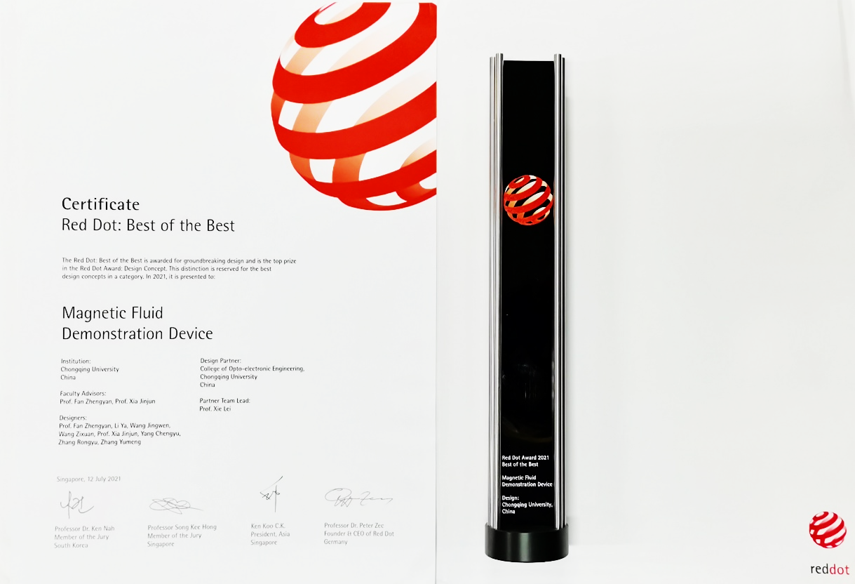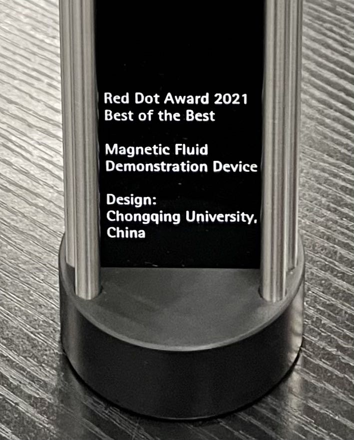 近日,有着“全球工业设计界奥斯卡”美誉的2021年德国红点设计奖(Red Dot Design Award)落下帷幕。威廉体育williamhill谢磊副教授与艺术公司夏进军副教授、范正妍副教授共同组建的设计团队凭借设计作品《Magnetic Fluid Demonstration Device磁流体演示仪》获得2021 Red Dot: Best of the Best(红点设计“至尊奖”)。