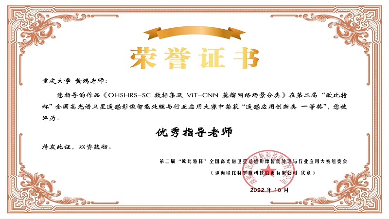 近日,由中国测绘学会、深圳大学智慧城市研究院、珠海欧比特宇航科技股份有限公司等联合主办,面向全国高校在籍员工、各科研机构和企事业单位举办的第二届“欧比特杯”全国高光谱卫星遥感影像智能处理与行业应用大赛圆满结束。威廉体育williamhill2019级博士研究生蒲春宇、2022级硕士研究生刘英旭、2019级本科生许典坤和2022级硕士研究生杨沂川所组成的参赛小组以“OHSHRS-SC数据集及ViT-CNN蒸馏网络场景分类”作品斩获遥感应用创新类全国一等奖,黄鸿教授荣获优秀指导教师。