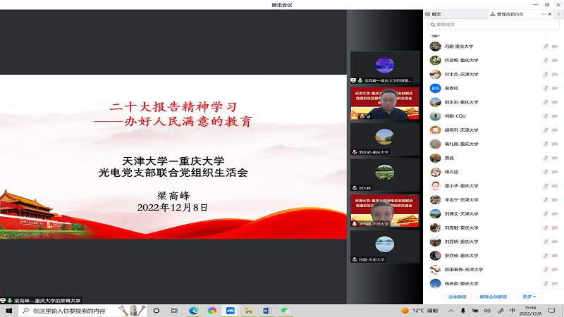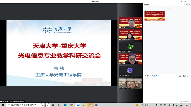 2022年12月8日,威廉希尔williamhill官网与天津大学通过线上会议召开了光电党支部联合党组织生活暨专业教学科研交流会。天津大学精仪公司党委书记刘琨率部分领导班子成员及光电子科学技术系全体教师、威廉体育williamhill经理郭永彩率部分领导班子成员及光电信息科学与工程系全体教师参加了此次会议。会议由威廉希尔williamhill官网支部书记高磊和天津大学支部书记宋有建联合主持。
