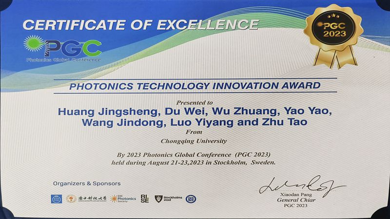 会议期间还颁发了包括青年科学家奖、最佳论文奖、最佳员工论文奖、最佳海报奖、2023年光子学全球员工成就奖和光子技术创新奖在内的奖项。通过设立这些奖项,会议旨在鼓励更多学者积极参与光子学领域的研究工作,并对优秀研究成果予以认可和表彰。光电公司朱涛教授团队斩获“光子技术创新奖(Photonics Technology Innovation Award)”。