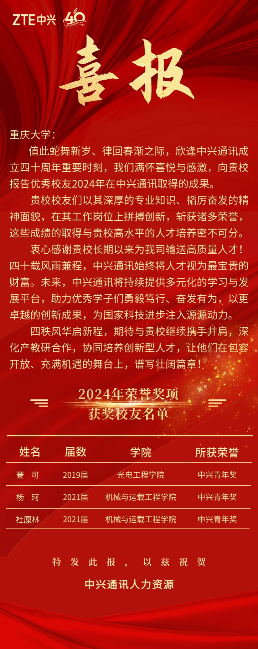 近日, 中兴通讯股份有限公司向公司发来喜报, 公司2019届仪器科学与技术专业硕士毕业生蹇可,凭借出色的工作表现和卓越的专业能力,荣获中兴通讯2024年度公司级荣誉。这一成就不仅是蹇可个人的荣耀,更是公司人才培养成果的生动体现。