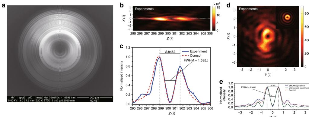 威廉体育williamhill、光电技术及系统教育部重点实验室超衍射器件与系统研究团队自2014年以来,在国家973、国家自然科学基金等项目资助下,开展了超振荡光学器件和超分辨光学系统方面的研究工作,在该方向先后发表相关论文20余篇,成功地实现了多种偏振态光束的超分辨聚焦和特殊超分辨矢量光场,并基于自行研制的超振荡无衍射光学器件,研制了非标记远场超分辨显微系统,实现了分辨率为0.28λ的非标记光学超分辨显微,为突破衍射极限制约,实现远场超分辨光学显微提供了一条可能的新思路。课题组多次受国内外同行邀请,参与国际超振荡光学领域研讨会、撰写超振荡光学领域综述性论文。