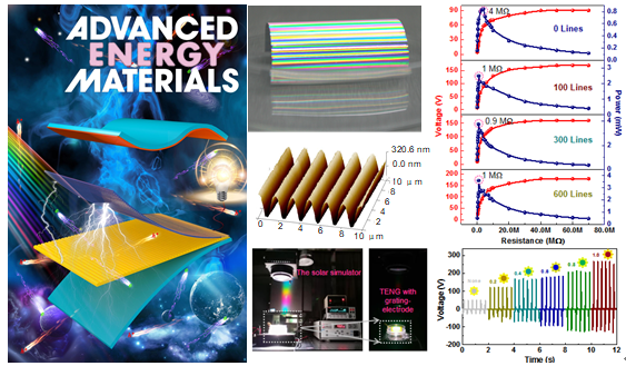 能源方面,团队主要针对摩擦发电机的两大核心问题:如何有效提升摩擦发电机表明电荷密度的同时降低其输出阻抗。团队联合中国科公司北京纳米能源与系统研究所王中林院士和杨亚教授,通过构建纳米光栅电极结构,首次成功的将等离子体激元引入到摩擦电领域。系统的研究了光照、波长、微结构尺寸等因素对摩擦发电机性能的影响。结果表明,表面等离子体衰变出的热电子-空穴对将摩擦发电机输出提升了4.5倍的同时成功的将其内阻降低了75%。相关研究成果在著名国际期刊Advanced Energy Materials(IF: 24.884)发表,并被选为内封面(Inside Cover)。