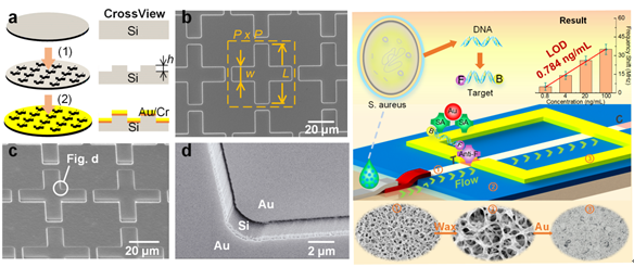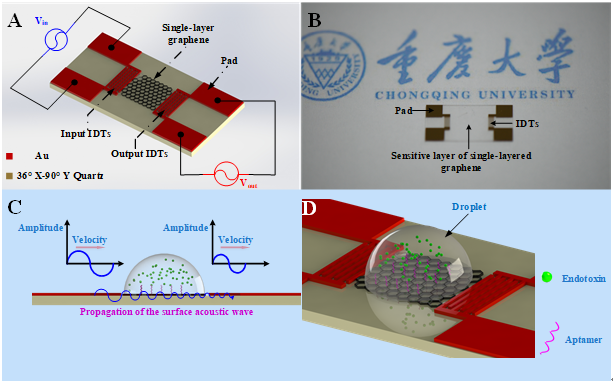 生物方面,团队针对传统生物传感器以金膜为敏感层,并通过金巯基来捕获末端修饰巯基的生物分子的种种弊端,采用了CVD生长的单层石墨烯薄膜作为敏感材料(0.3-0.4nm)。采用戊二醛交联法固定适配体于单层石墨烯表面,用于捕获内毒素。相较于传统的敏感层,灵敏度增加至3.53 ng/mL。相关研究成果近期已被Nature出版社期刊Microsystems & Nanoengineering录用。
