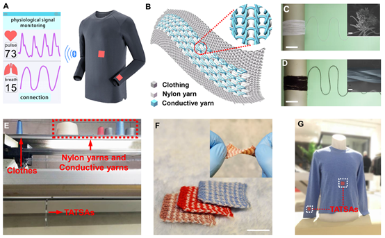 (A) 缝制在袖口和胸口的传感器监测呼吸和脉搏