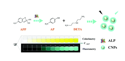 本文提出了一种新颖的酶触发原位变色/发荧光反应策略,其检测原理是对氨基苯磷酸钠盐(APP)通过去除磷酸基水解形成的对氨基苯酚(AP),进一步与二乙烯三胺(DETA)反应,生成淡蓝色碳基荧光纳米粒子(CNPs),进而实现荧光和比色多信号ALP活性的监测。该策略可以在较低的温度下快速获得CNPs,实现快速、可靠、高灵敏的检测。此外,基于该策略还可以实现荧光法和比色法多信号ALP活性测定和抑制剂筛选,文中报道了在人体血清ALP活性监测中取得的突破性结果。相关实验结果表明,该探针无需任何预处理,具有灵敏度高、响应迅速、操作简便和特异性高等优点。同时,双信号定量方法可以显着提高检测精度和多样性,并降低血清诊断中的假阳性和阴性率。相关方法和结果为临床诊断中的ALP活性监测提供了一个高度敏感的检测方法与分析平台,并为现场快速诊断中,直观监测酶活性引入了一个新的途径。
