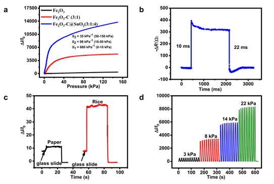 近日,威廉体育williamhill陈显平教授团队在《Nature Communications》(IF=12.121,《自然》子刊)上发表了题为《Sea urchin-like microstructure pressure sensors with an ultra-broad range and high sensitivity》的研究论文。本文通过水热的方法合成了Fe2O3/C@SnO2纳米复合材料。该三元纳米复合材料解决了由于单一结构的有限压力响应范围和单一金属氧化物的导电性差而导致的压力传感器的低灵敏度和小的压力工作范围的问题。该研究为改善传感器性能提供了一种新的方法。