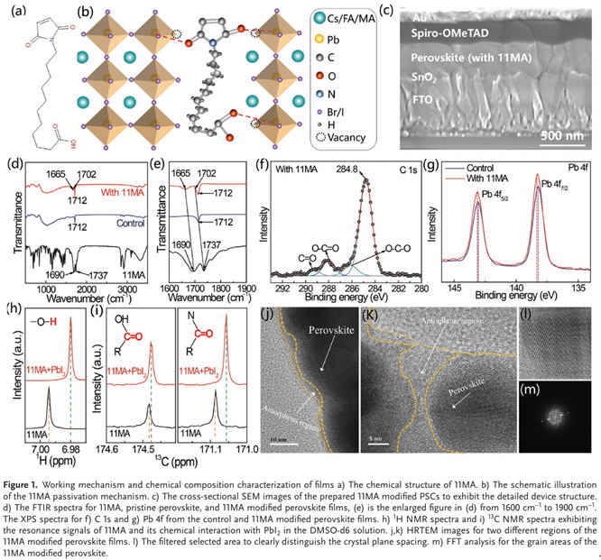 近日,威廉希尔williamhill官网陈江照研究员团队在国际知名学术期刊Advanced Energy Materials(top期刊)发表题为“Trap State Passivation by Rational Ligand Molecule Engineering toward Efficient and Stable Perovskite Solar Cells Exceeding 23% Efficiency”的文章。钙钛矿薄膜表面和晶界陷阱态导致的非辐射复合损失直接阻碍了钙钛矿太阳能电池功率转换效率和稳定性的进一步提升。鉴于此,通过调控钙钛矿结晶和钝化薄膜缺陷来抑制非辐射复合损失显得尤为必要。在本研究中,作者开发了一种简单而有效的多功能添加剂策略,即通过在钙钛矿前驱液溶液中引入同时含有羰基(羧基和酰胺基)和常疏水烷基链的11-马来酰亚胺基十一酸(简称11MA)。结果表明,引入11MA后,11MA分子两端的羰基能够和Pb2+进行强的配位作用,从而改善钙钛矿薄膜的结晶、减少陷阱态密度和抑制晶界离子迁移,进而同时提升器件的效率和稳定性。基于11MA的器件实现了23.34%的功率转换效率,而参考器件仅仅显示了18.24%的效率。而且,改性的器件在大气环境中老化3000小时后仍然保持初始效率的91%。本研究工作为开发多功能添加剂分子来同时提升器件的效率和稳定性提供很好的指导。