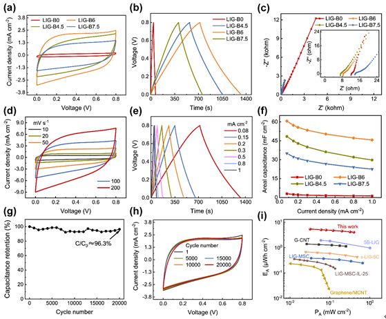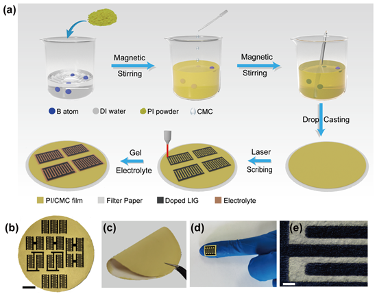 随着微型电子设备以及柔性/可穿戴器件的快速发展,对于微型柔性储能设备的需求日益增加。其中,微型超级电容器具有高能量/功率密度,快速冲/放电速度,稳定的循环性能以及超长的工作寿命等优点,因此受到广泛的关注。在这项工作中,我们提出了一种简单方便且可扩展的方法,以柔性的掺杂硼砂和三聚氰氨的聚酰亚胺(PI)/羧甲基纤维素(CMC)复合薄膜为衬底,通过激光直接书写制备了硼和氮掺杂的3D多孔石墨烯电极。B掺杂提高了电极的导电性和亲水性,有利于电解质离子在多孔石墨烯电极中的传输和渗透,从而极大地提高了MSCs的电化学性能。同时,B和N的掺杂可以引入赝电容,对于提高电容性能也具有重要意义。作为证明,基于B掺杂的电极组装的柔性超级电容表现出高面电容(60.6 mF cm-2),高能量密度(5.393 μWh cm-2),稳定的循环性能(20000次循环后保持96.3%以上)以及优异的机械灵活性。此外,本文还结合了第一性原理(DFT)仿真计算,从原子微观角度探索B掺杂对电极与电解质离子间相互作用的影响。仿真的结果表明B掺杂增强了石墨烯电极与电解质离子之间的吸附,有利于电解质的传输,与实验结果相吻合。鉴于该微型超级电容器的优异的性能,其在可穿戴设备,柔性微型电子器件等领域有潜在的应用价值。