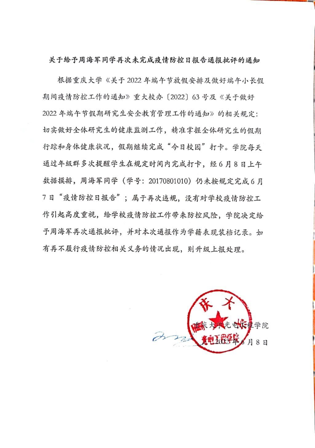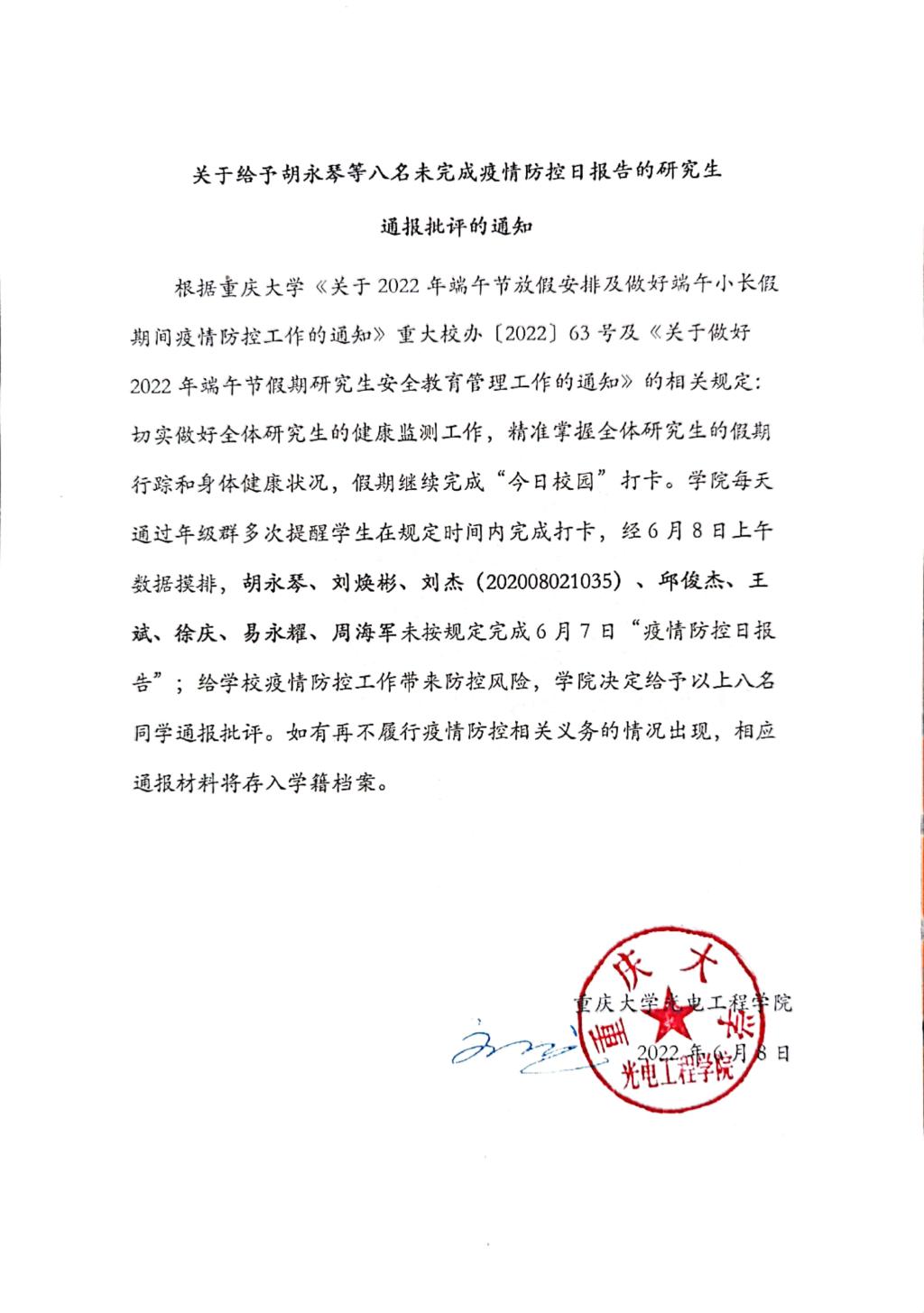 关于给予胡永琴等八名未完成疫情防控日报告的研究生通报批评的通知