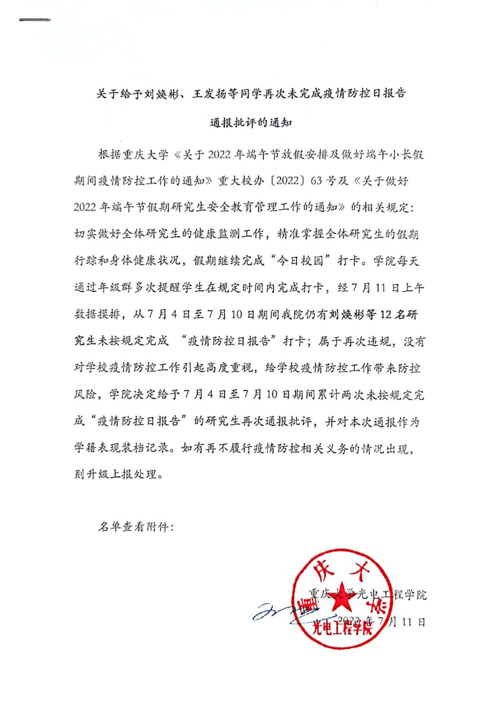 关于给予刘焕彬、王发扬等12名同学再次未完成疫情防控日报告通报批评的通知