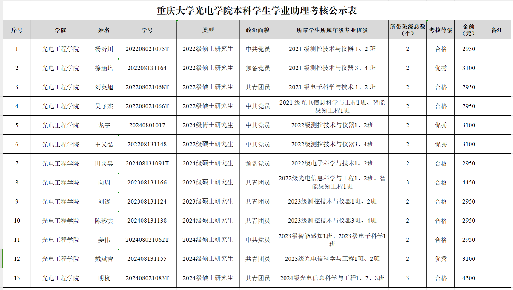 根据公司《关于开展2024- 2025学年第一学期本科员工学业助理考核工作的通知》,经班级评定、辅导员评价、公司审核,现将光电公司2024—2025学年第一学期本科员工学业助理考核情况公示如下: