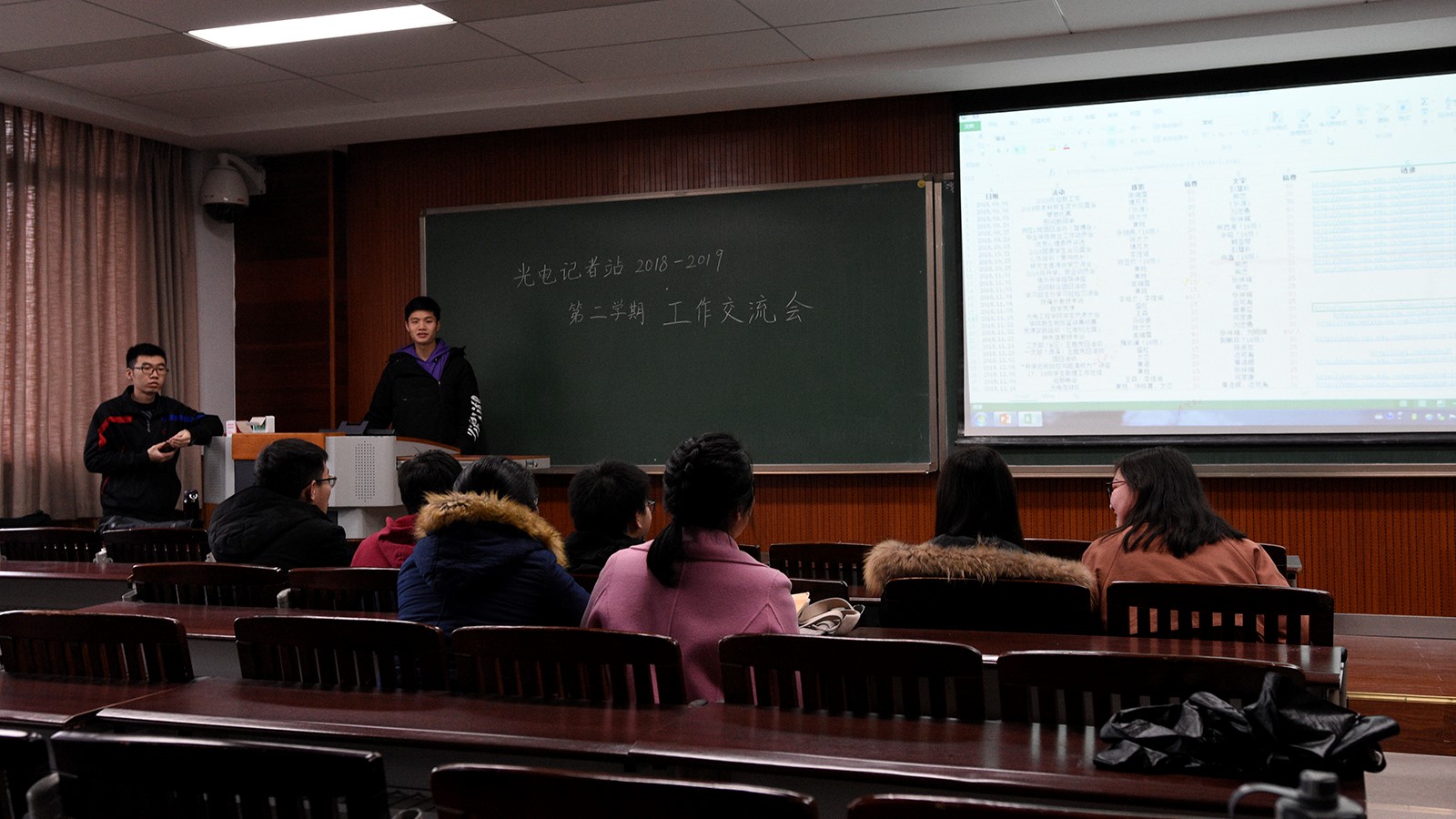 本次会议由两位副站长主持,光电记者站17年级与18年级的全体干事参加。围绕着“回顾过去,规划未来”而展开。会议伊始,副站长李佳诚回顾了过去一学期光电记者站的工作情况,对工作的内容、稿件的质量等进行了展示,也向在座同学分享了上学期进行教授专访工作过程中的点滴。随后,李佳诚通报了本年度光电记者站工作要点,要求规范日常新闻稿件的采编。同时,提高意识,分工协助,做好院庆前期宣传准备工作,为公司院庆的顺利进行,贡献一份力量。