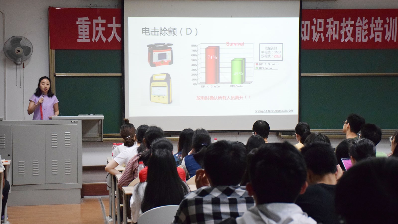 2019年5月16日下午三点,威廉希尔williamhill官网第九届急救知识和技能培训活动在威廉希尔williamhill官网虎溪校区综合楼DZ122教室开展。活动分为两个板块:理论知识学习和技能实践操作,本次是由校医院的老师给同学们带来的理论知识的讲解,后续还将会分批次的进行实践操作。