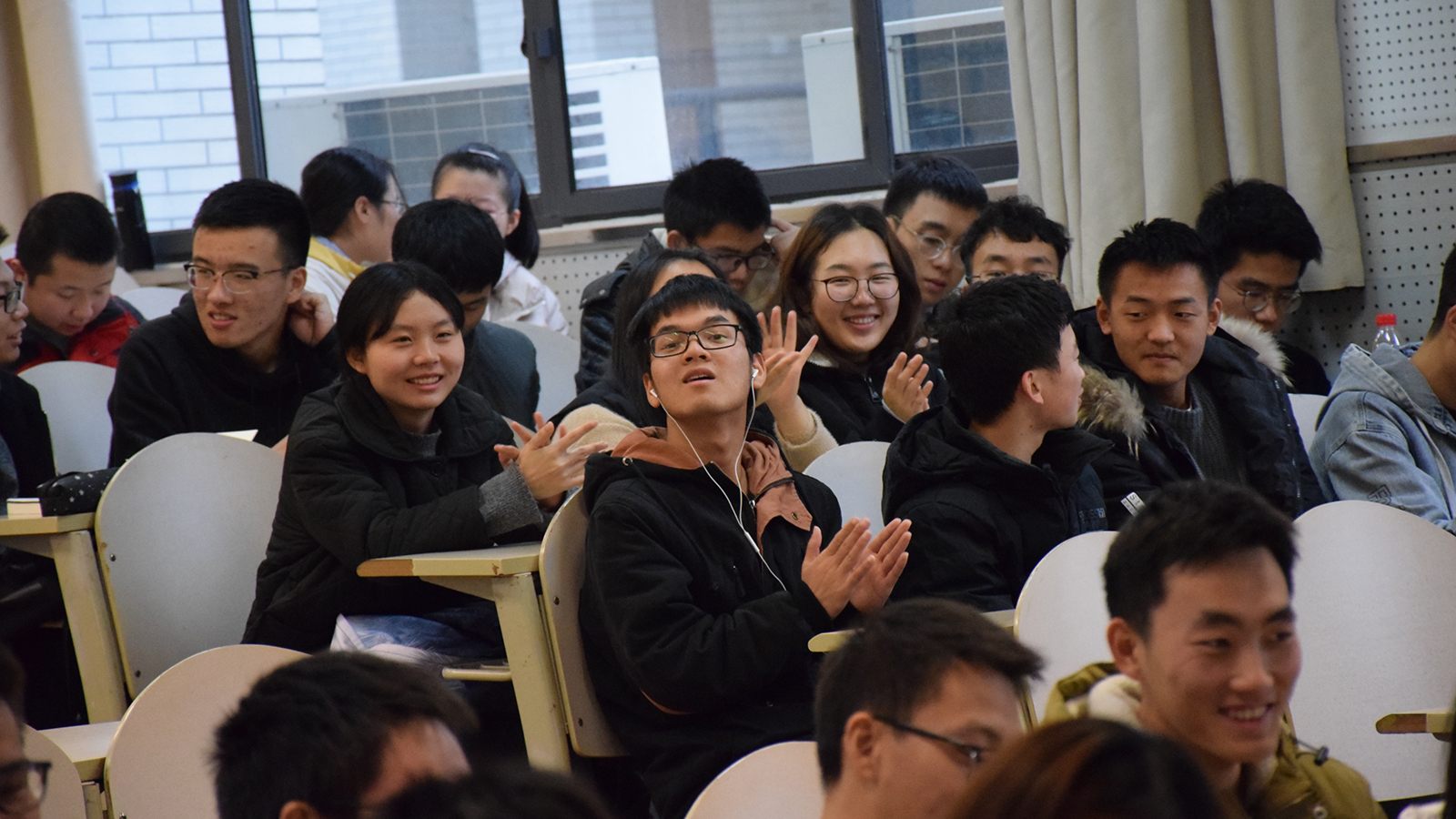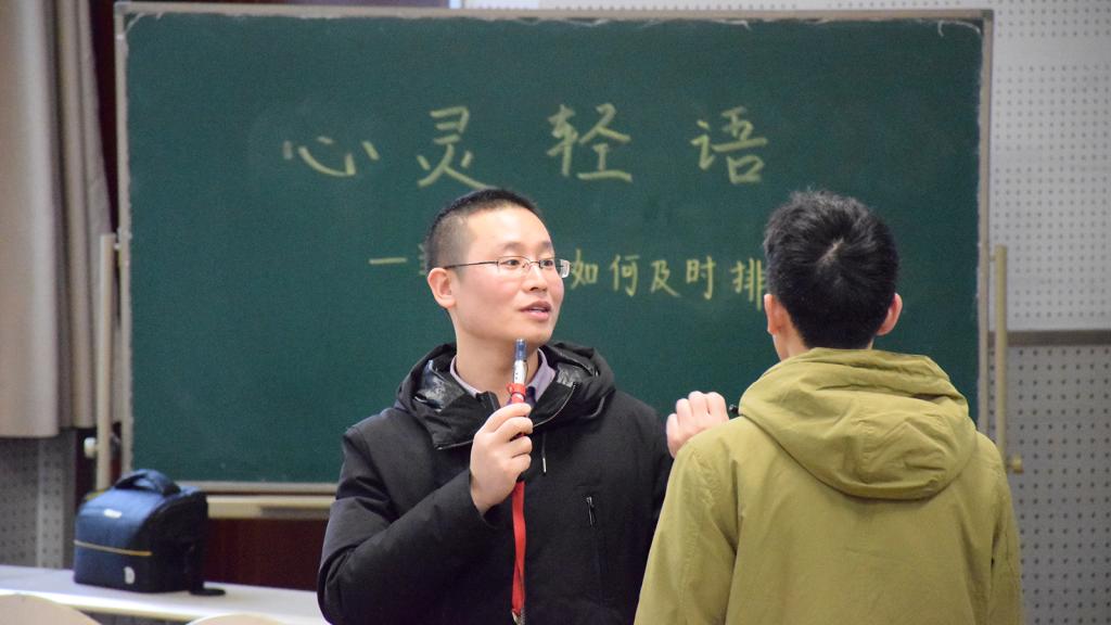 讲座一开始黄老师也不直奔主题,他先组织了到场的同学做体验,首先进行分组,同学们在组内相互介绍自己的姓名、爱好以及缓解压力的方式,同时要求同学们在这个过程中注意观察,用心倾听,借此来让同学们了解彼此。热烈的交流声在室内迸发,屋外的寒冷也敌不过同学们的热情。最后各个小组交流后,每个小组又派了代表总结组内发言。