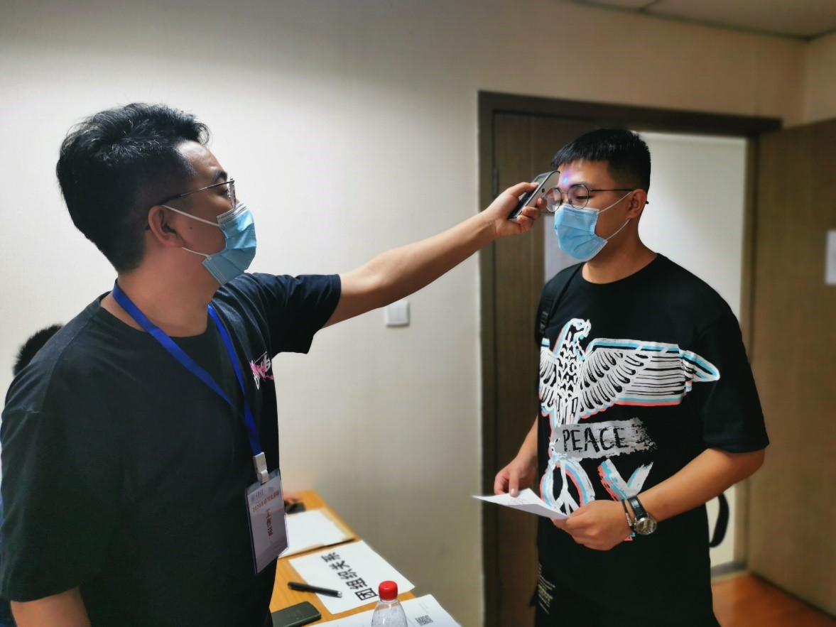 为配合疫情的防控工作,每位工作人员及新生必须佩戴口罩,工作人员为每个新生严格测量体温后,方可进行后续的报道工作。大家互相理解、积极配合,工作井然有序的进行着。