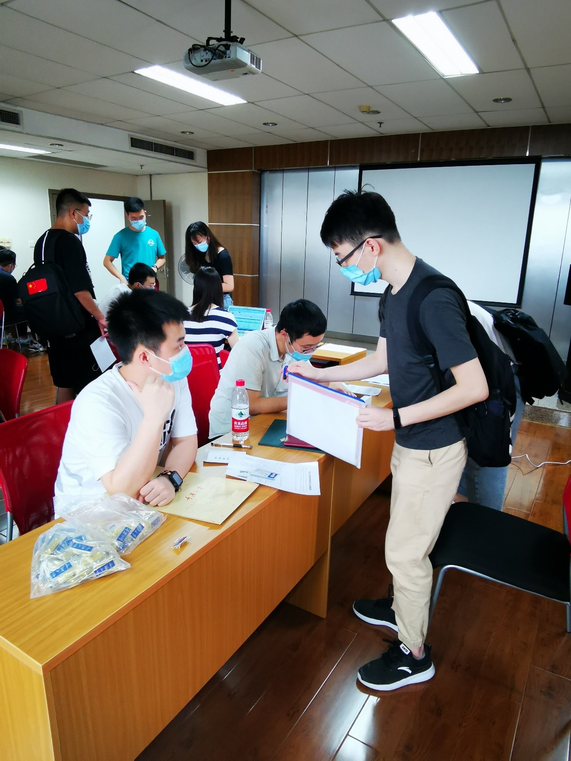 体温正常后,新生方可进行报到注册,工作人员严谨认真,新生耐心排队、积极配合,一切都进行的井井有条。