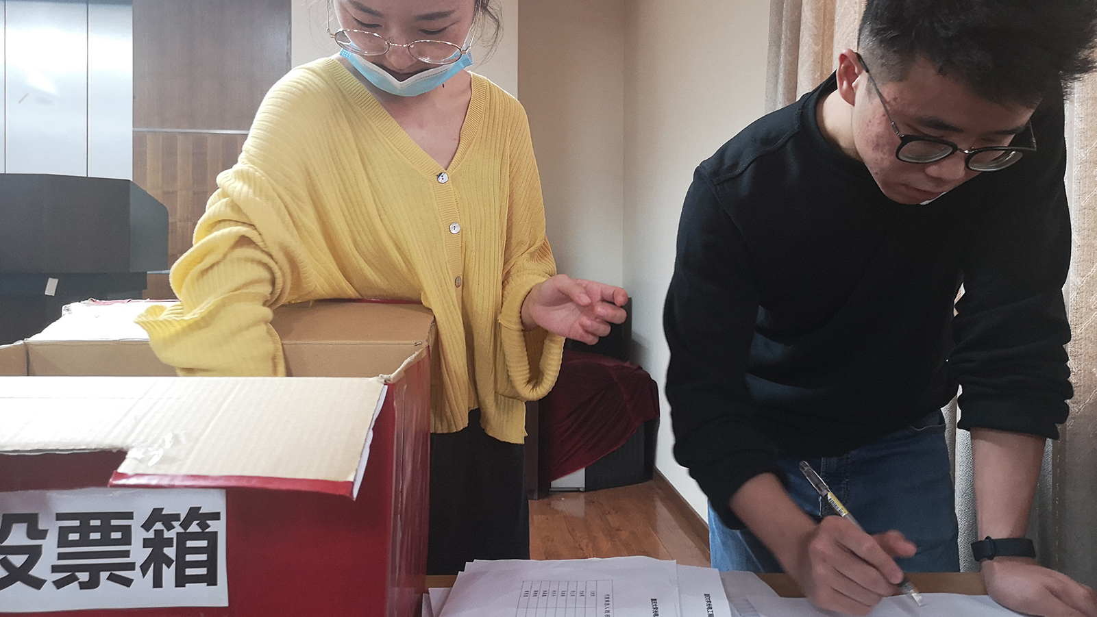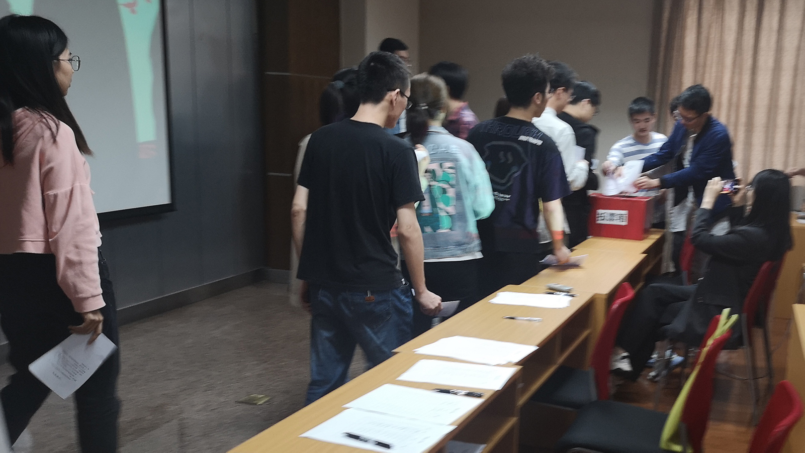 在参会同学认真听取了主持人的讲解之后,工作人员为每位同学发放了选票。经过慎重考虑后,同学们在选票上填写了候选人,随后在工作人员的引导下,有序走向选票箱前,郑重地投上了自己的选票。同时选举工作也全程由研团委员工会工作人员负责监票、统票。