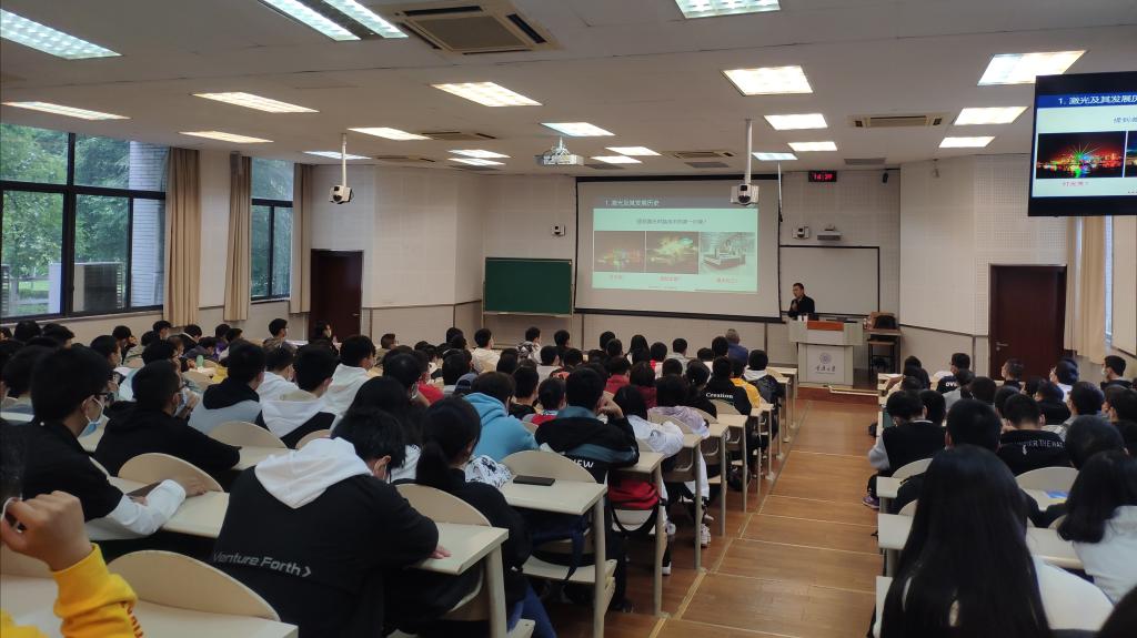紧接着朱涛以“炫目的激光”为题,带领同学们叩开玄奥深邃的光电之门。他从光谈起,回溯激光发展历史,娓娓道来。从激光理论的提出到应用,再到现阶段的前沿科研视野,介绍了激光的无处不在。他指出:从缤纷彩光到量子计算机,炫目激光的故事从古老的光开始。无论是改变世界的5G网络,或是走进千家万户的光纤通信,还是为社会带来福祉的激光医疗,甚至保家卫国的神光系统,都离不开光电技术的支撑和深入。优质激光光源,支撑信息行业,推动工业进步,助力保家卫国。有“理”走遍天下,无“光”寸步难行。