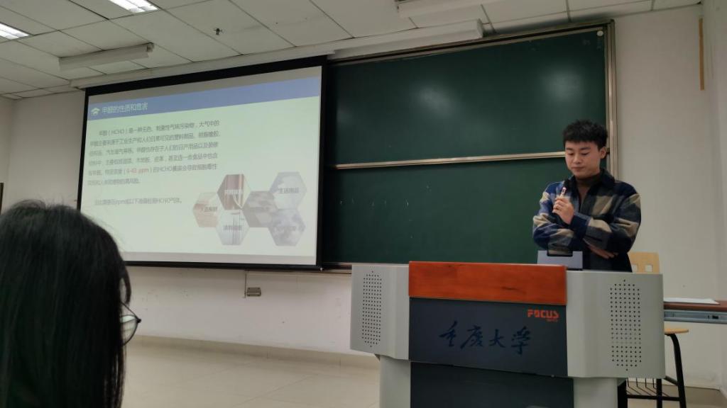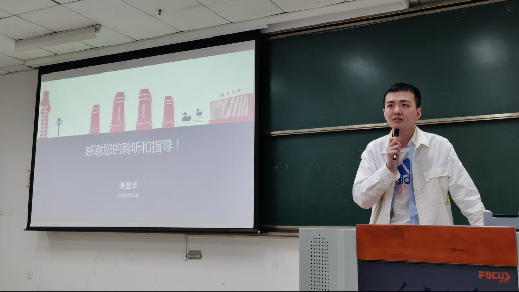 第三位是19级硕士研究生王宇航,报告题目是基于MXene的甲醛气敏研究,分别研究背景与现状、实验方案与过程、实验结果与分析进行介绍,详细阐述了甲醛的性质和危害同时展示了实验步骤以及测试系统,通过表征结果对传感器性能以及机理进行分析。