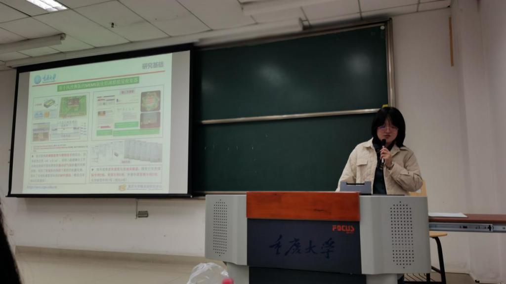 第二位汇报人是来自微系统研究中心的博士研究生陈鑫,报告题目是风能能量收集技术,分别从研究背景及其意义、研究基础、课题组前期工作、研究内容五个方面进行阐述,介绍了设计的基于伯努力效应的风能摩擦纳米发电机,优势在于克服了以往研究中单一薄膜在涡街和颤振现象中起振风速较高以及低转换效率的不足的问题。