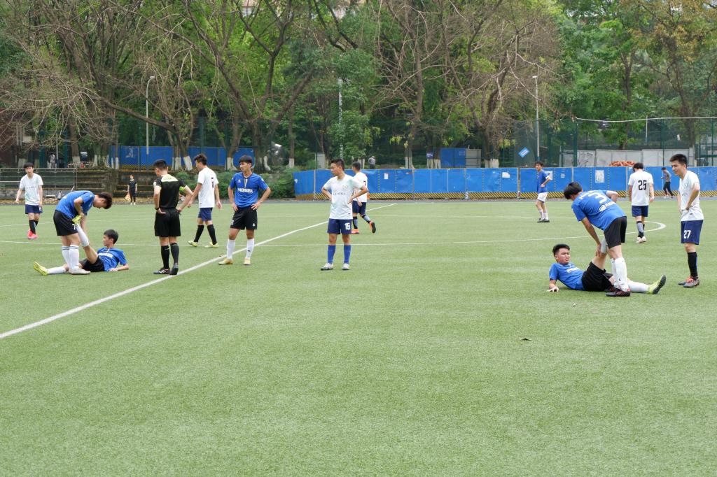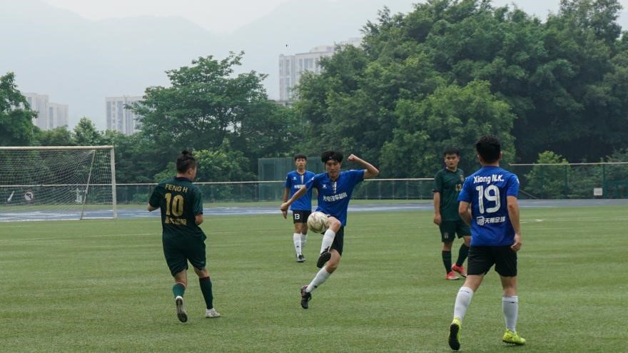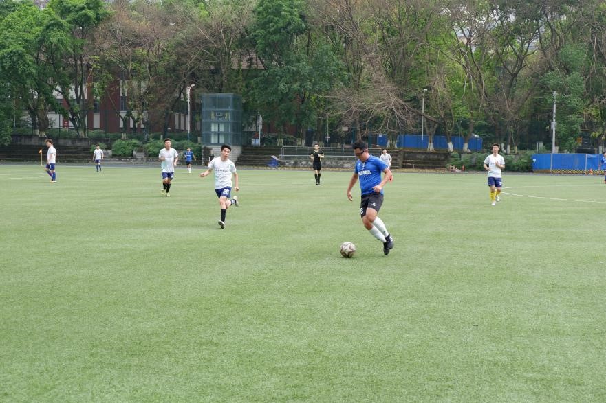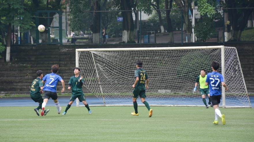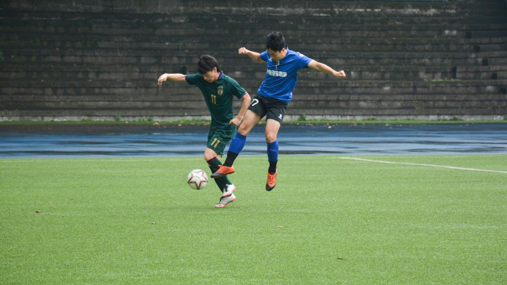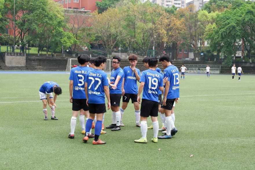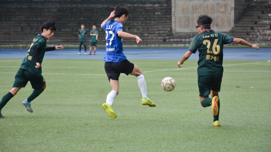 在决赛中迎接光电公司的正是实力强劲的老对手建筑城规公司球队,在2020年研究生足球联赛小组赛中光电汽车联队就曾与建筑城规公司交手并战至1:1平,而这次决赛中在球队只有光电球员参与的情况下,场上局势很难预测。5月13日中午12:30决赛在朦胧细雨中正式拉开帷幕,比赛一开始,双方球员就展现出超强的竞技状态,19分钟时许,建筑城规球员在获得任意球机会后直接射门,被我方门将顽强扑出,但对方球员杨新旗在人群中抓住机会一脚补射拿下一分,比分来到了0:1。面对不利开局我方球员依旧冷静应对,积极创造进攻机会,36分钟时,我方球员21号孔德译在进攻时抓住对方后场防守漏洞,瞄准时机一脚射门成功破门,将比分改写为1:1,场上局势再次陷入胶着。下半场一开始,双方球员就积极组织进攻,56分钟时场上局势风云突变,对方利用任意球机会远射破门,比分来到1:2,我方球队再次陷入被动。面对严峻的场上局势和不利的天气条件,我方球员展现出过人的竞技意志,在后续时间里积极拼抢,多次对对方禁区造成威胁并造成对方球员多次犯规,在比赛仅剩5分钟时我方7号徐州抓住对手后防失误成功破门,将扳平比分,随着终场哨声响起,常规时间结束,常规时间比分最终定格在了2:2平。