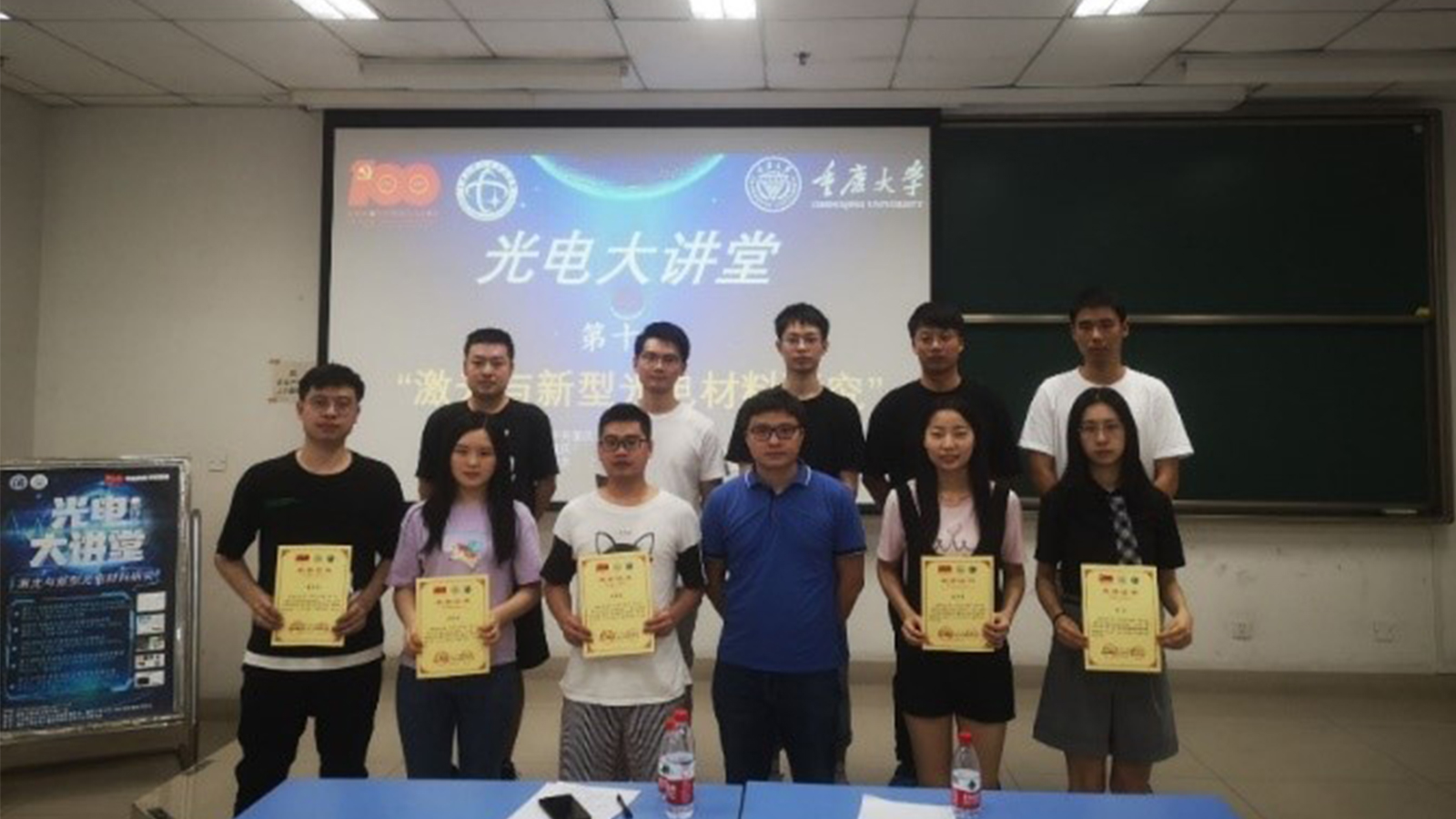 紧接着,皮老师对五位研究生的报告进行了深刻而细致的点评,对于报告中涉及到的某些问题与他们进行了深入的交流讨论,高度肯定了光电大讲堂的活动形式,称赞了同学们的优秀表现,最后为报告人颁发证书,并合影留念。至此,“光电大讲堂第10讲”圆满结束。