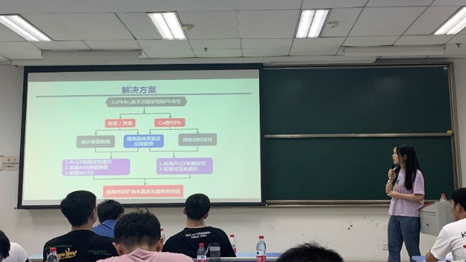 第三位报告者是2019级光学工程专业博士研究生莫琼花,报告题目是“无机钙钛矿纳米晶稳定性及光学器件”。她提出了能够有效提高CsPbBr3纳米晶PLQY和稳定性的两种方法,并得出了SiO2包覆法能实现ASE及阈值降低,而Sn2+掺杂法能实现WLEDs的结论。最后为大家讲解了Cu基钙钛矿纳米晶实现可见光通讯的实际应用。