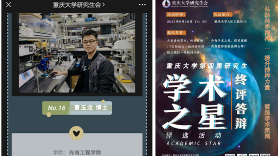 学术建设方面,威廉体育williamhill团委研究生会以光电论坛、光电大讲堂、光电研习堂为主线,以营造浓厚学术氛围为重点,主动拓展学术活动“新路子”。在院团委研究生会与各党支部牵头下,截至发稿日期,已经成功举办“光电大讲堂”十次,活动反响热烈,在全校师生中广受好评;在威廉希尔williamhill官网第五届研究生学术活动月期间积极组织学术活动,共计七场,因此荣获威廉希尔williamhill官网第五届研究生学术活动月全校仅五名的“优秀组织奖”;积极响应威廉希尔williamhill官网第四届研究生“学术之星”评选活动,推送曹玉龙博士等四位研究生参选,曹玉龙博士最终获评全校仅十位的“学术之星”荣誉称号,展现了公司研究生的学术风采;此外,积极组织全员研究生参加“研知有理知识竞赛”、“英语配音大赛”、“创新创业大赛”等学术活动,丰富了同学们课后生活,展现了公司学子的个性和智慧。