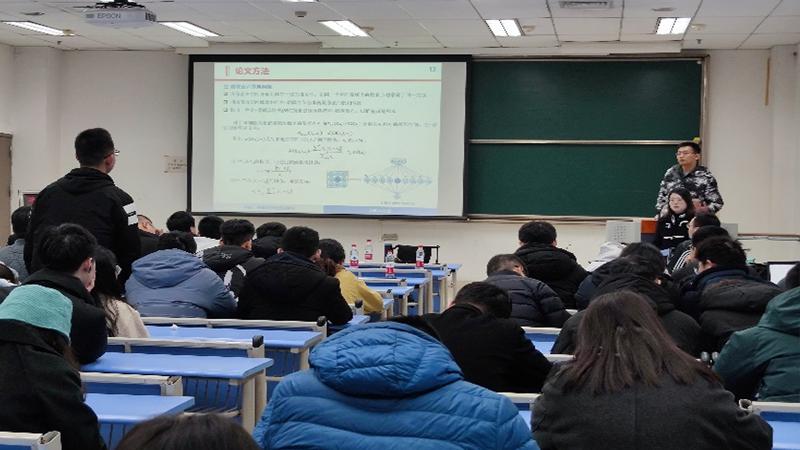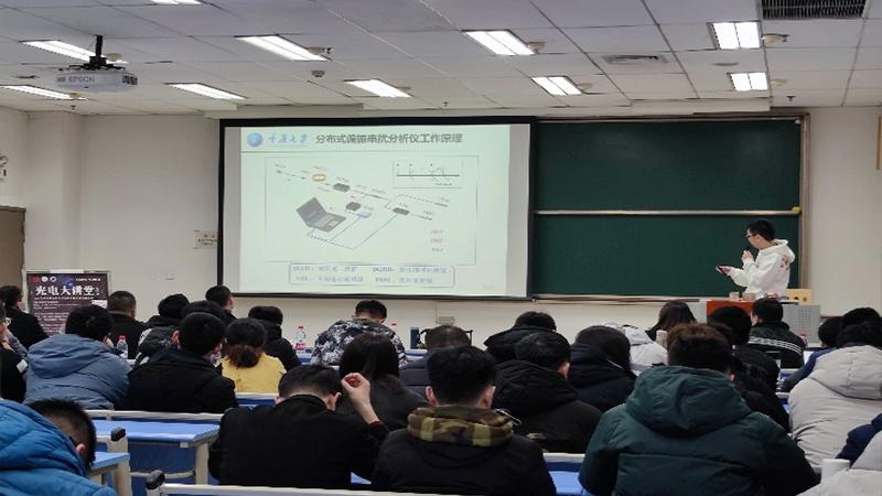 第二位主讲人是来自20级光学工程的博士研究生张泽恒,报告题目为《基于分布式偏振串扰分析的保偏光纤液压传感》。他介绍了基于保偏光纤的分布式偏振串扰技术,讲解了偏振串扰测量的原理、光纤涂覆层在压力测量中的影响、基于保偏光纤的液压传感单元设计方案以及相关的实验测试结果,最后结合目前传感器所存在的问题提出了几点优化方案,并回答了老师和同学们的问题。