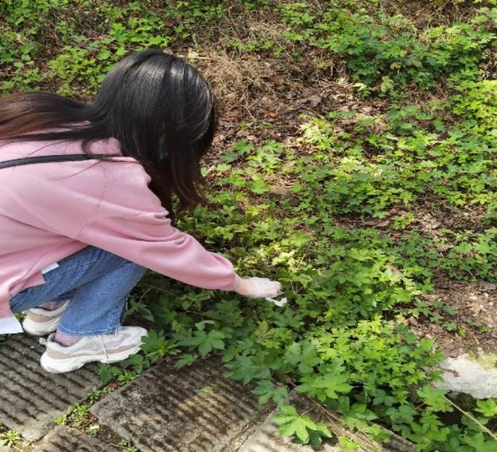 下午一点半,志愿者们在歌乐山脚下集合完毕,分成多组,手持垃圾袋,沿着石梯和走道,开始清理路边以及草坪上垃圾。