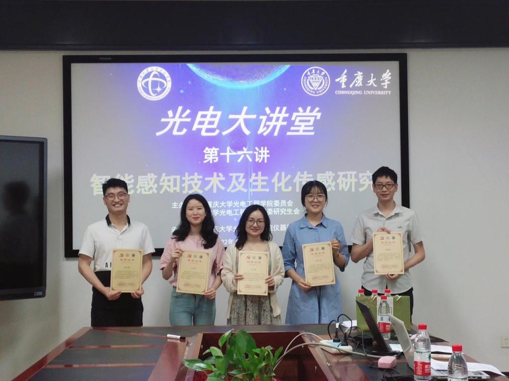 在此次光电大讲堂中,五位优秀的硕博研究生为同学们介绍了智能感知技术及生化传感研究的相关内容,不仅对相关领域进行了详细的科普介绍,也进一步增强了同学们的科研热情。会后,工作人员为五位嘉宾颁发证书并合影留念。