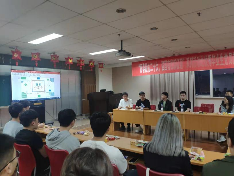 优秀毕业生党员就业经验分享会,由优秀毕业生党员分享自己的就业经验并为学弟学妹进行就业指导,分为企业专场、深造专场和选调生专场。本次首场分享会是企业专场,邀请了王欣然、伍志林和周昶担任分享嘉宾。