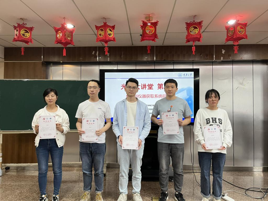 在此次光电大讲堂中,五位优秀的硕士研究生为同学们介绍了信息获取与仪器系统研究的相关内容,不仅对相关领域进行了详细的科普介绍,同时详细解答了同学们提出的问题,进一步增强了同学们的科研热情。会后,工作人员为五位嘉宾颁发证书并合影留念。