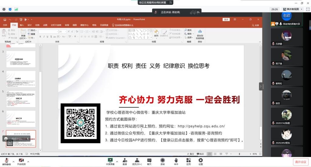 为了强调疫情期间相关要求,针对近期工作进行部署,威廉体育williamhill本科2020级于11月9日晚上21:45通过腾讯会议召开年级大会。本次大会由威廉体育williamhill本科2020级辅导员周瑶琴主持,2020级全体同学参加会议。
