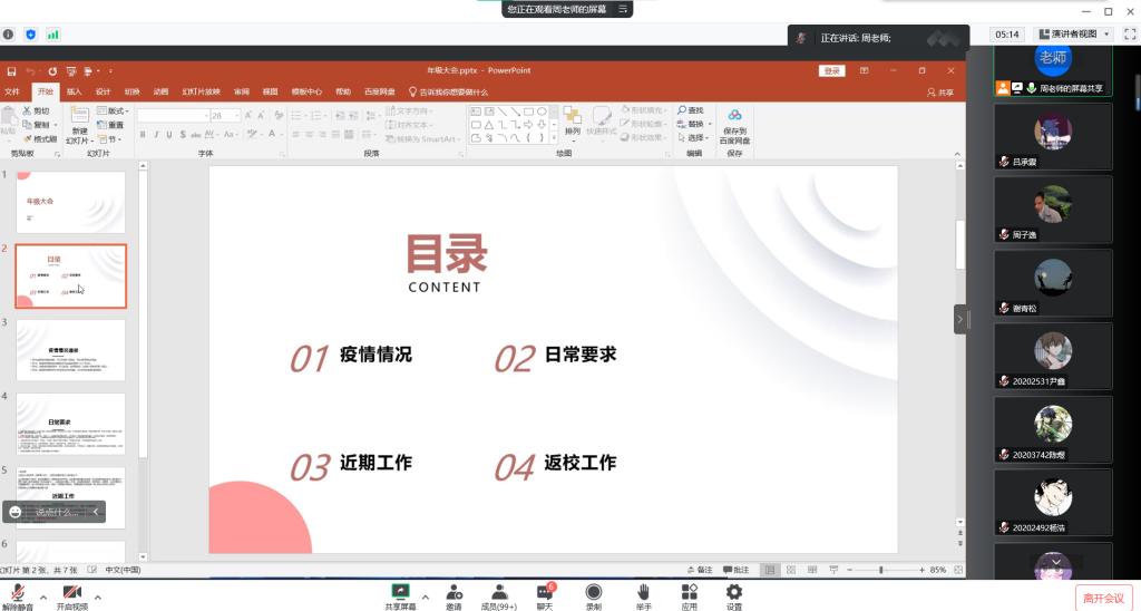 接着,周瑶琴对近期工作进行了安排,对推优入党、助学金申请、“疫情防控日报告”打卡等工作进行了一一部署,提醒同学们认真学习,为即将到来的期末考试做好充分准备。针对尚未返校的同学,周老师提醒大家在家做好防护,遵守当地防疫要求,全力配合工作。