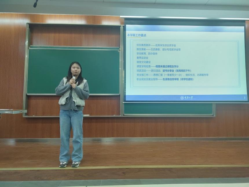 随后,罗老师向同学们预告本学期的工作要点,介绍了公司搬迁完成后,公司教职工办公地址和联系方式变更的情况,对接下来的综合素质评测、推优表彰、党团工作要点、职业规划等方面逐一进行通知和说明。在会上,她提醒各位同学关注自己的学分修读情况,做好学业规划;同时强调全体同学应当遵守校规校级,严格要求自己,做好宿舍文化建设,严禁使用违规电器,加强校园安全意识,提高警惕远离诈骗和网贷,鼓励同学们积极参加校园文化活动,全面发展。