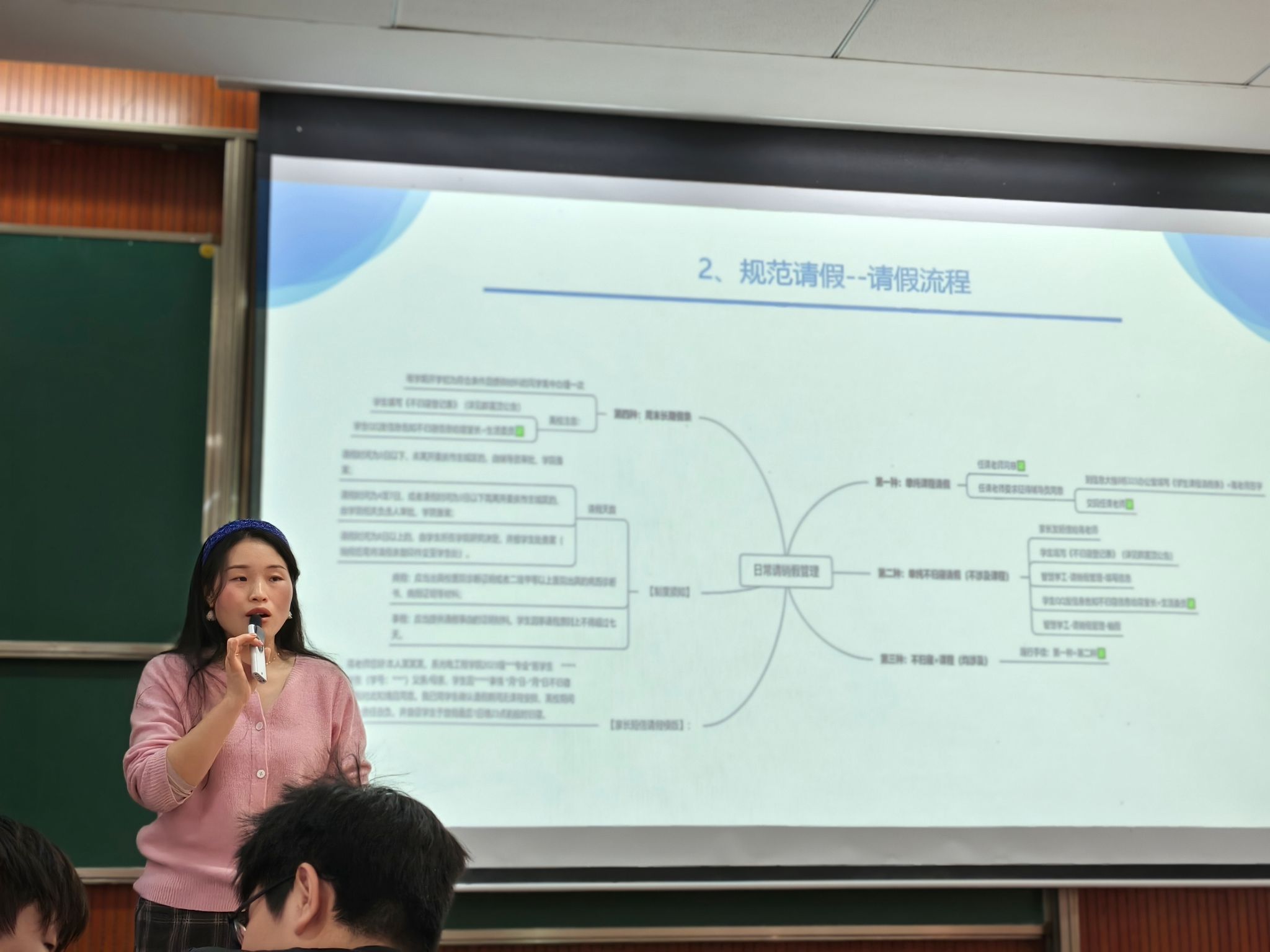 2025年4月3日下午1:30至2:30,威廉体育williamhill2023级年级大会在虎溪校区第一教学楼D1131教室举行。会议由2023级辅导员蒋晓红主持,全体2023级员工参加,会议主要围绕学习情况分析、入党推优流程介绍、寝室安全问题、以及请假流程规范等内容展开。