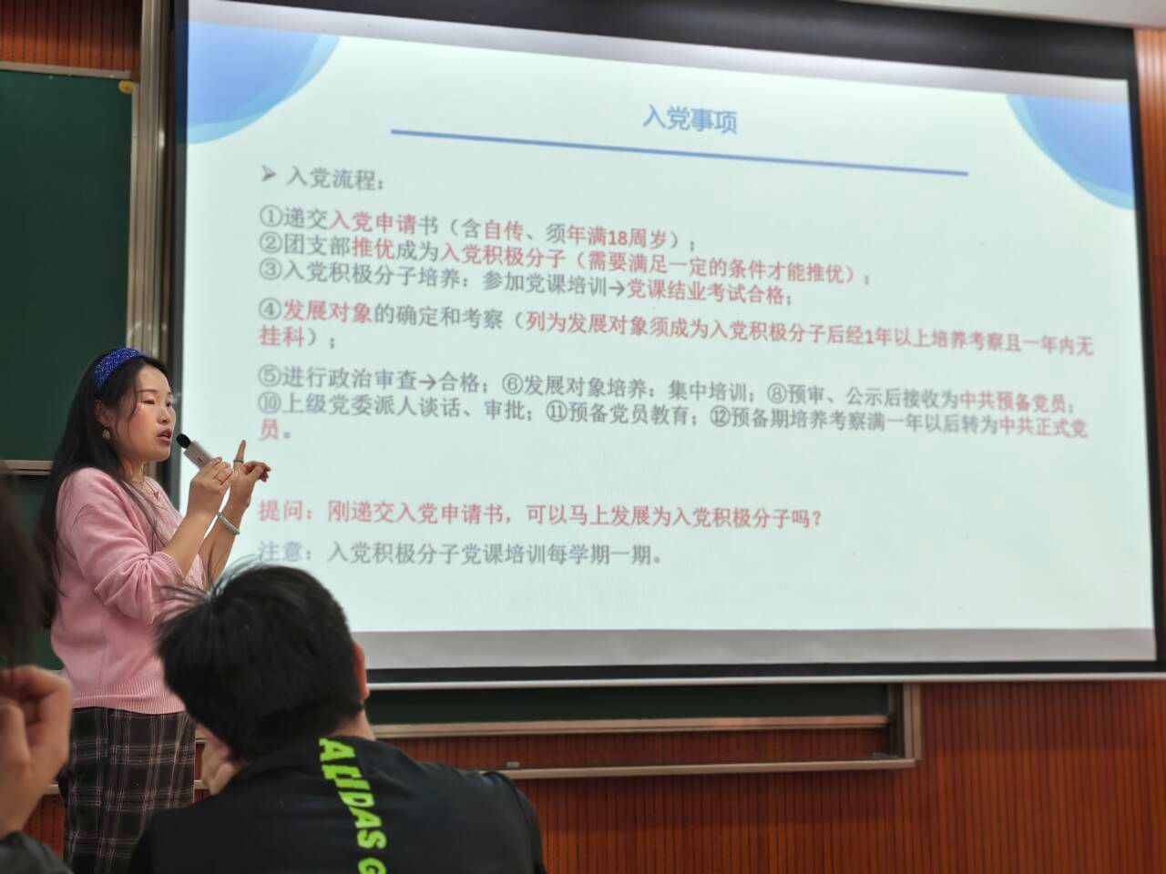 随后,蒋老师对入党的相关事项进行了详细介绍,包括入党推荐对象和推荐条件,主要从德智体美劳五个方面对入党推荐对象进行了要求,还介绍了详细的入党流程——从递交入党申请书到转为中共正式党员。