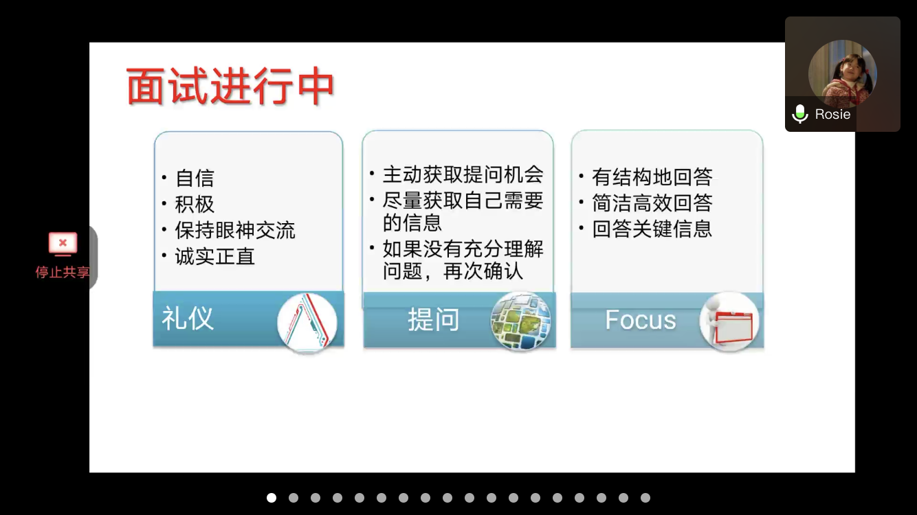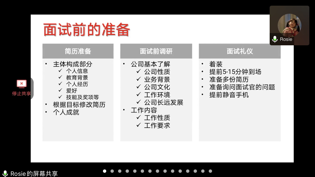 首先,Rosie介绍了面试前的三方面准备。一是简历准备,简历的主体构成部分为个人信息、教育背景、个人经历、爱好、技能及奖项等,同学们要根据各自的目标修改简历,认真填写个人成就;二是面试前进行调研,充分了解公司的性质、业务背景、文化、工作环境、长远发展和工作的性质要求等基本信息;三是面试礼仪方面,做到着装得体,提前5-15分钟到场,准备多份简历和询问面试官的问题,手机提前静音。尤其是在疫情情况下,需准备好个人设备,选择合适的室内场所,调试好面试的角度。然后,Rosie介绍了面试进行中的注意事项。一是礼仪方面,面试者应保持自信积极的态度,诚实地回答问题。二是提问环节,面试者要主动获取提问机会,获取自己需要的信息,如果没有充分理解面试官提出的问题,进行再次确认,以免出错。三是做到简洁高效,有结构地回答关键信息。最后,Rosie介绍了面试后的总结。总结面试问题、回答方式和逻辑,确认自己是否适合这个公司,是否适合这个岗位,能在岗位中得到哪些收获。她提出,每一次的面试都是一种历练,我们要在这些历练中不断地提升自己,优化自己面试的技巧,做好这些,我们才能在下一次的面试中做到更好。