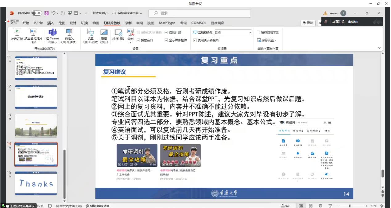 王佳硕通过具体案例展示了复试在研究生入学考试中的重要性,强调要重视笔试,从笔试、综合面试、英语面试等方面展开了详细介绍。针对综合面试中的PPT陈述环节,王佳硕以自身经验为例,为同学们指出陈述核心和PPT制作要点。对于复习中的重点,他强调要重视笔试成绩,确保及格;不能过于依赖网上资料,要尝试自己总结归纳;认真准备面试内容,梳理自己本科阶段参与的项目。同时,他提醒初试分数刚过线的同学要关注调剂,做好两手准备。经验分享后,王佳硕针对同学们提出的问题逐一进行了细致的回答。