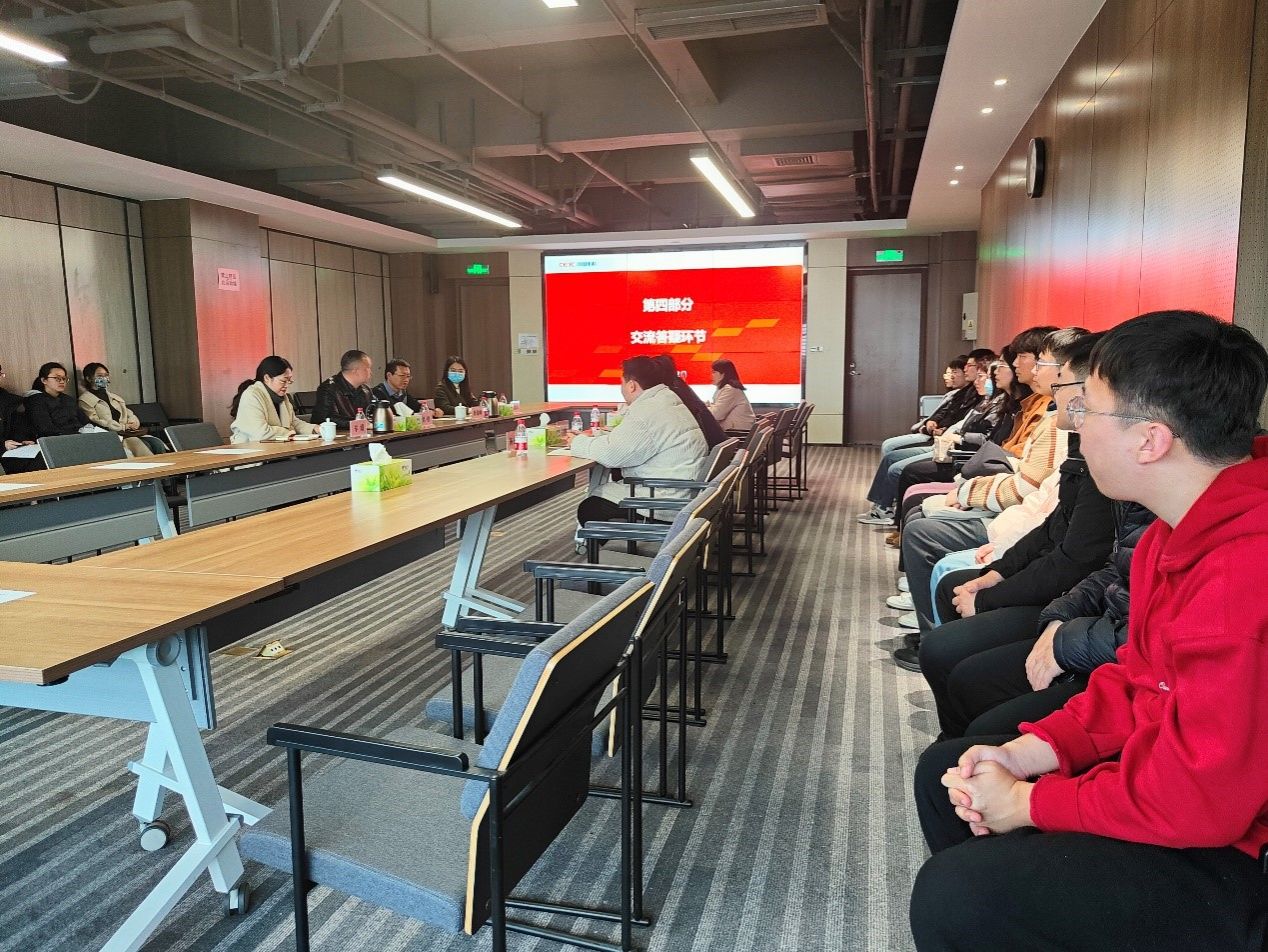 参观结束后,电科芯片与实践团队共同召开了校企座谈会。电科芯片人力资源部招聘主管陈建桥就企业发展历程、当前的合作情况和未来校企合作进行了介绍。在交流答疑环节,来自两个公司的硕士和博士员工代表分别就企业招聘需求和岗位的待遇、福利、简历设计和个人能力要求进行了提问。电科芯片人力资源部主任丁鹏指出,目前企业与员工间存在信息不对等的问题,导致优秀的员工难以找到适合自己的岗位。除此之外,他还着重强调在企业招聘中,企业人力资源部门相比技术能力会更看重员工的逻辑思维能力和沟通表达能力,为员工今后的学习指明了方向。