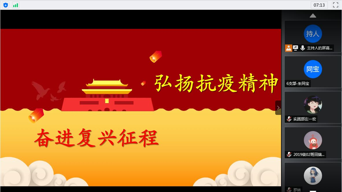 活动在19点30分正式开始。本次活动分为了五个部分进行。首先由主持人对本次活动的背景和意义进行了概括和讲解,并且对抗疫精神的内涵进行了详细的介绍:习近平总书记指出,“精神是一个民族赖以长久生存的灵魂,唯有精神上达到一定的高度,这个民族才能在历史的洪流中屹立不倒、奋勇向前。”在抗疫过程中,英勇的中国人民和武汉人民形成了新的守望相助、英勇战斗、顾全大局、逆行而上、敢于胜利、积极乐观的抗疫精神。