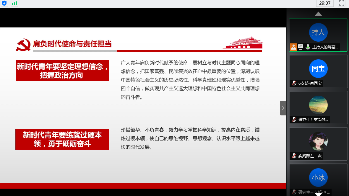 2020年6月5日晚19:30,为响应习近平总书记学习和弘扬抗疫精神的号召,威廉体育williamhill研究生团委在腾讯会议线上举行了一次特别的党团活动。公司光电学子积极参与其中,到会议开始前,已经有大量的同学入场就绪。