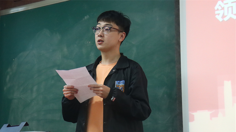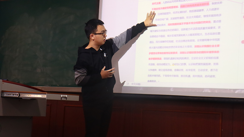 “‘衙斋卧听萧萧竹,疑是民间疾苦声。些小吾曹州县吏,一枝一叶总关情。’总书记以郑板桥这首诗为切入点,阐释了以人民为中心的实践,尊重人民的意愿,真正听取人民的呼声,树立以人民为中心的政绩观。”高天同学结合郑诗重点分析了习主席倡导的政绩观。